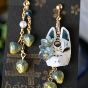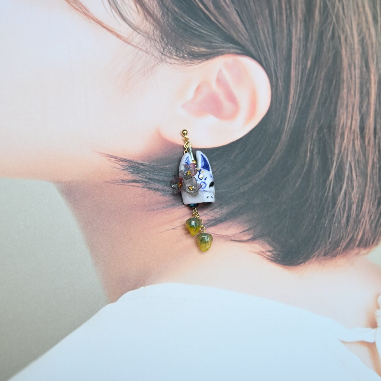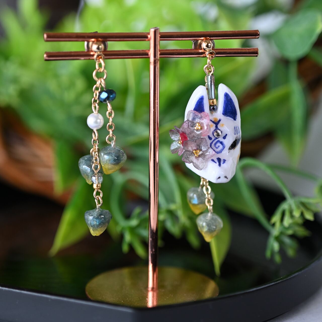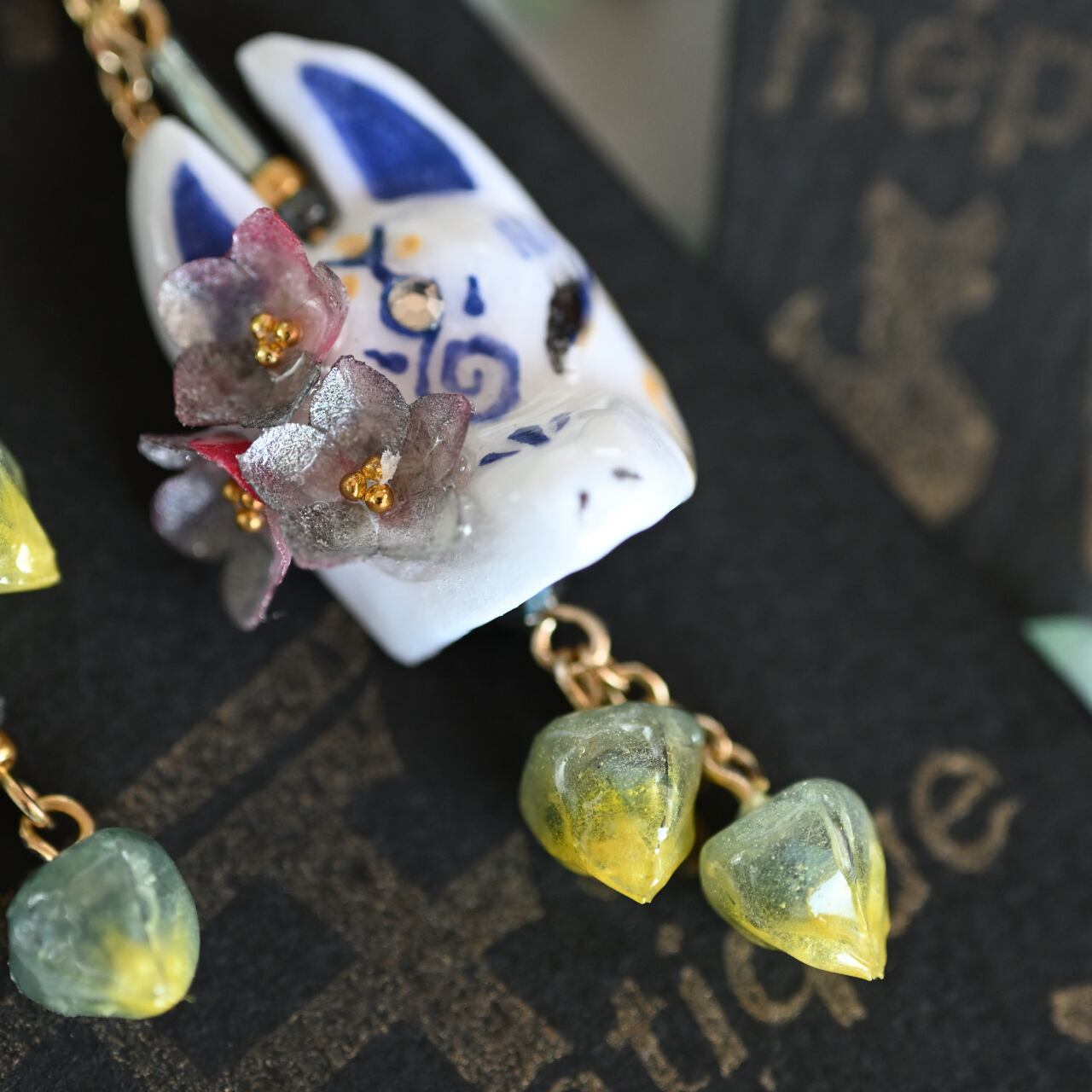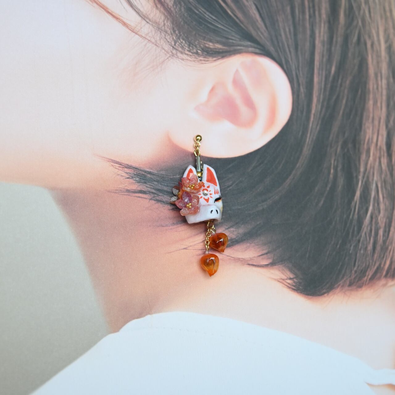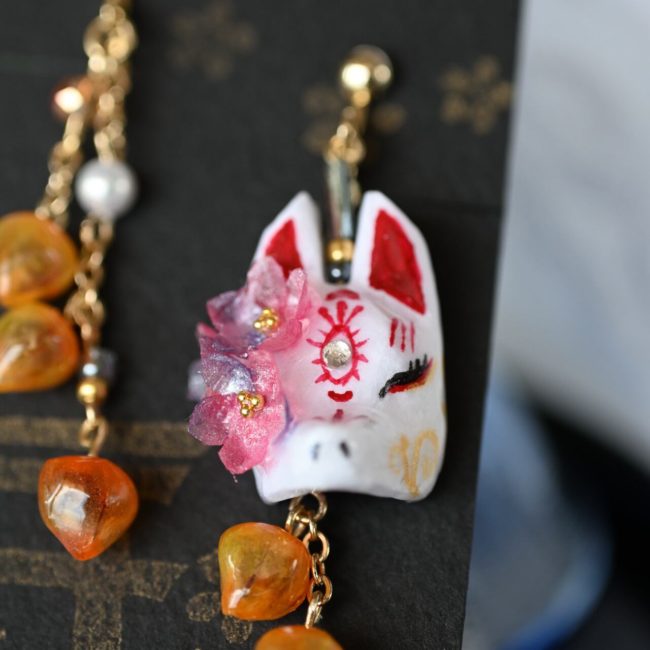 耳元で揺れる狐の面は、一つの芸術作品のように魅力的に仕上げました。