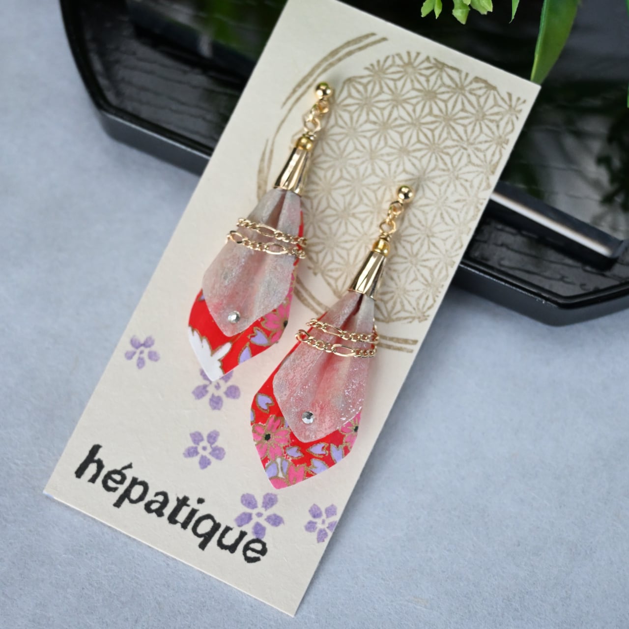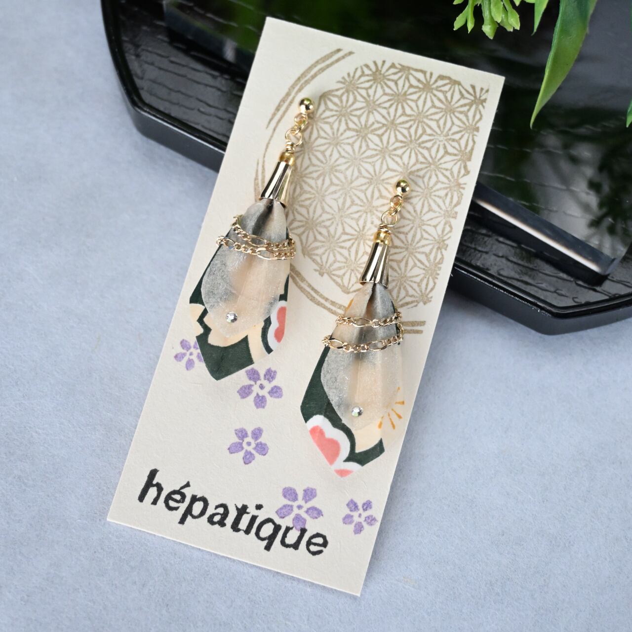 【千代紙木の葉:越中和紙ピアス/イヤリング】は、夏の日差しを受けて鮮やかに揺れる木の葉をモチーフにしたアクセサリーです。