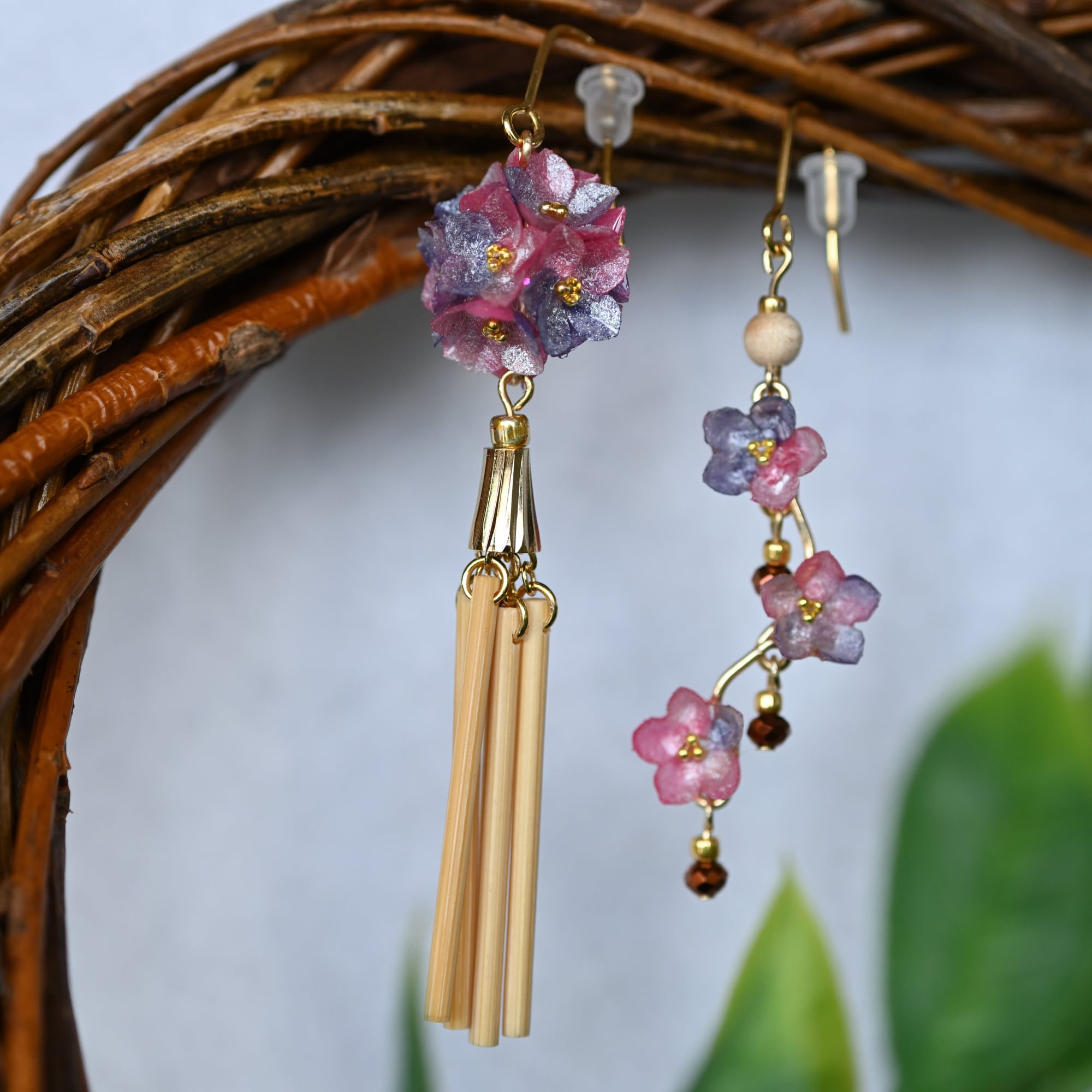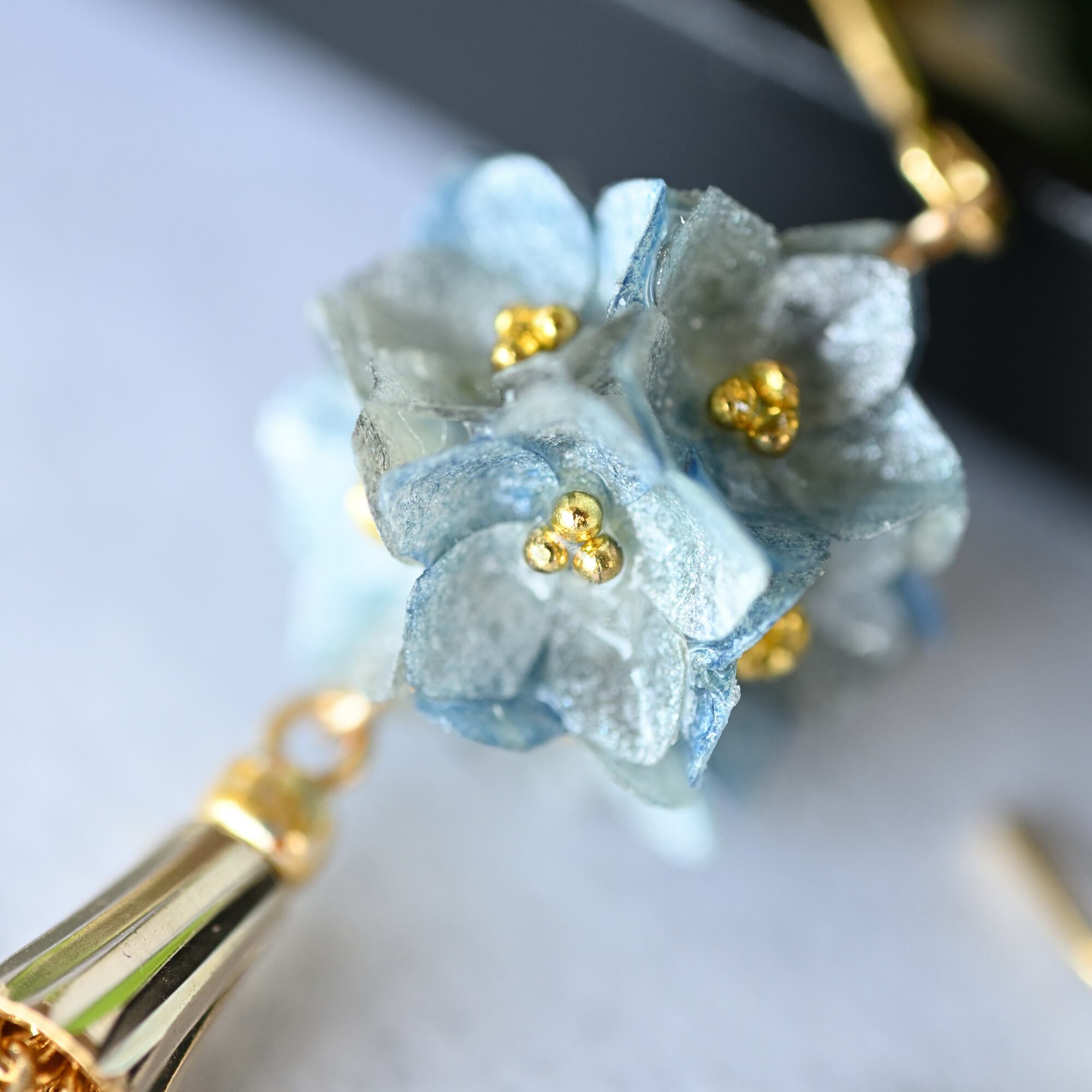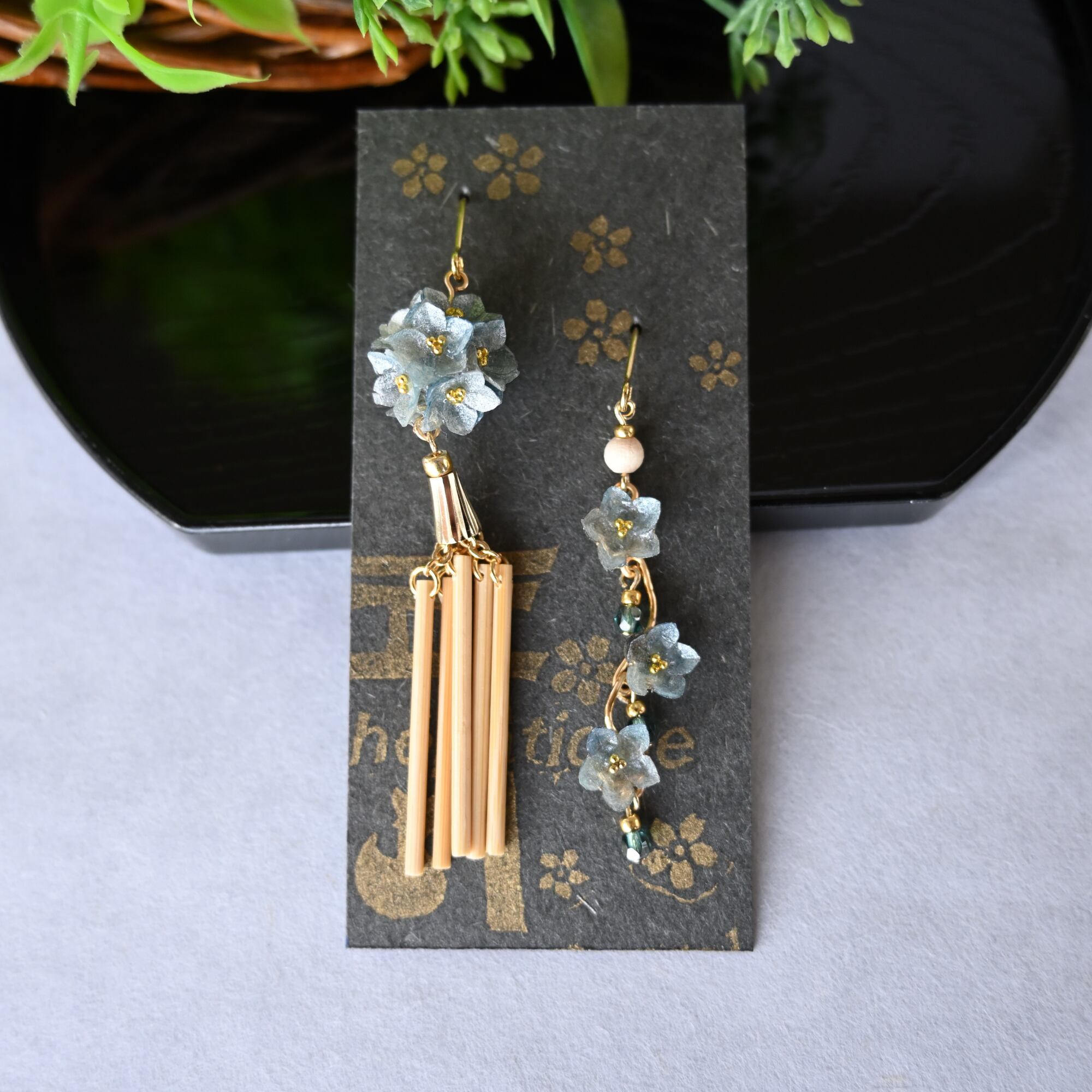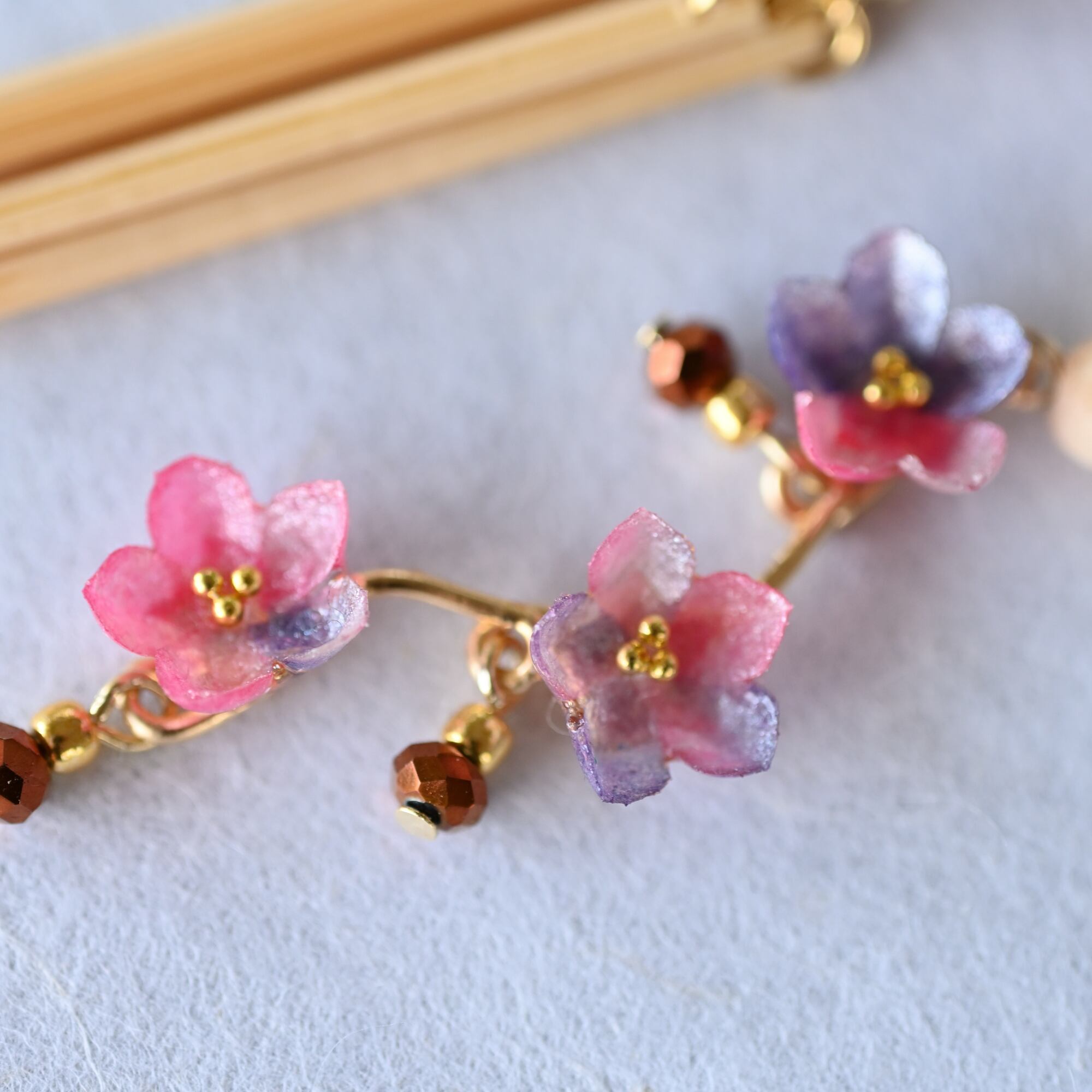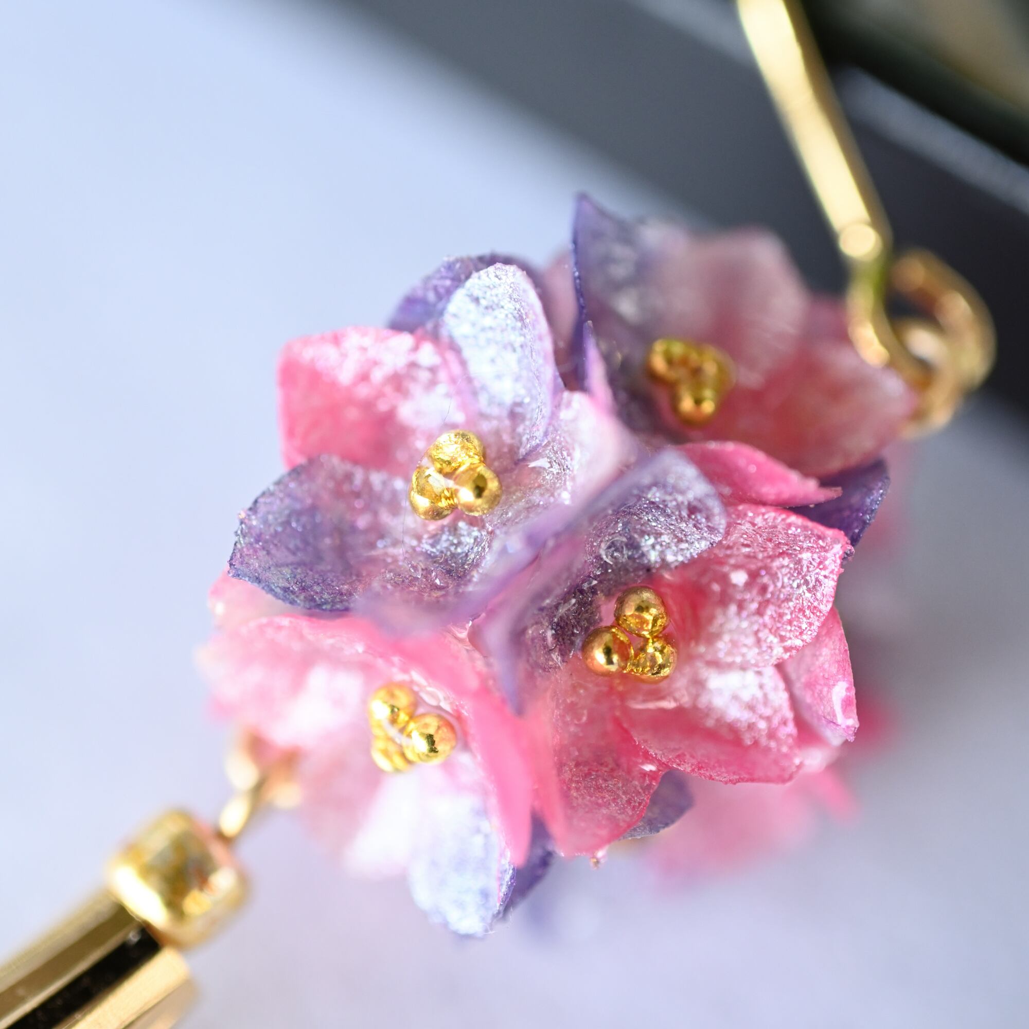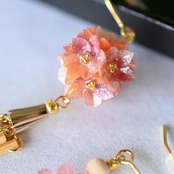 当作品では小さな花を12個集めて手毬にし、もう片方をはらはらと舞い落ちる供花に見立てて作っており、まるで耳元で優しく揺れる花々のように、上品な輝きを放ちます。