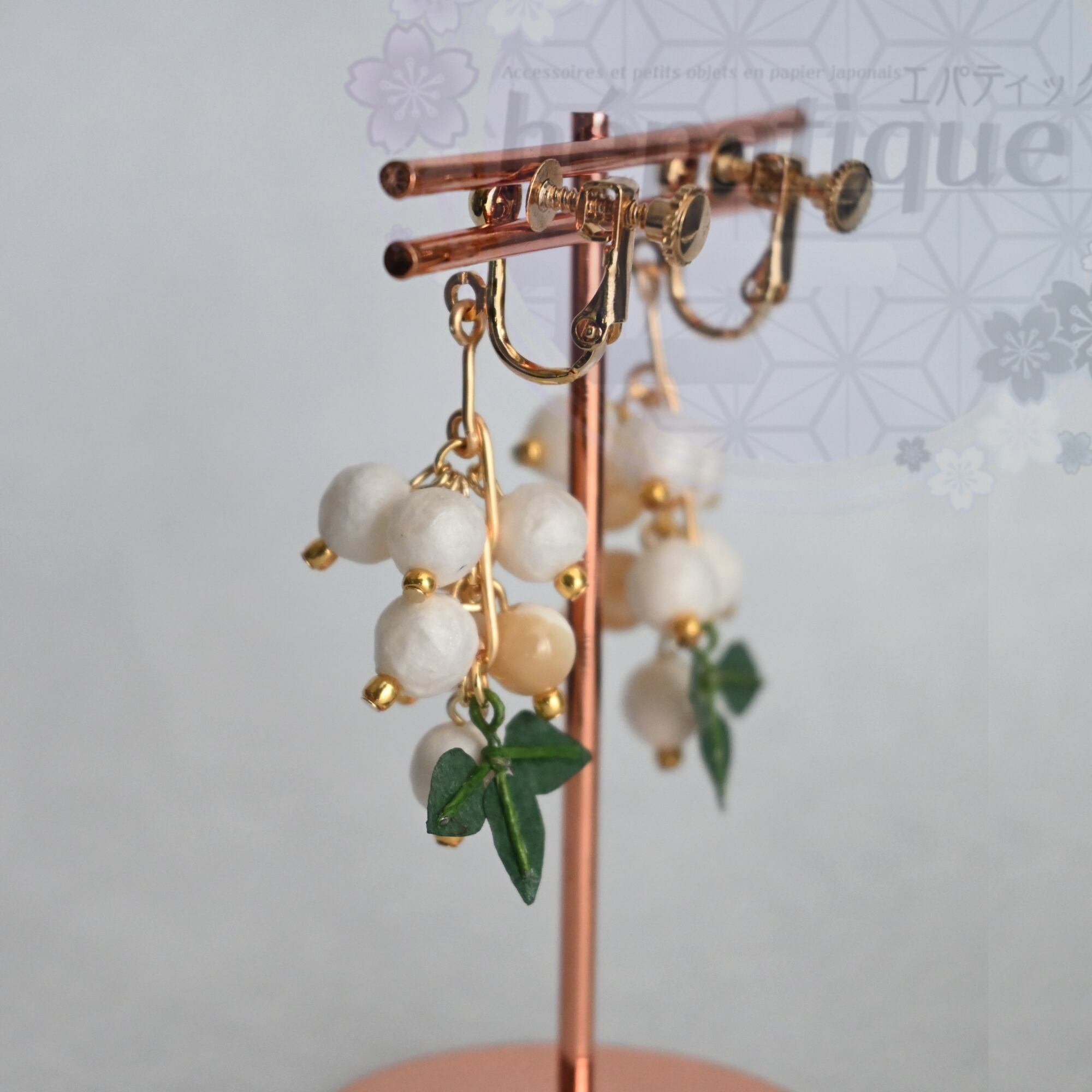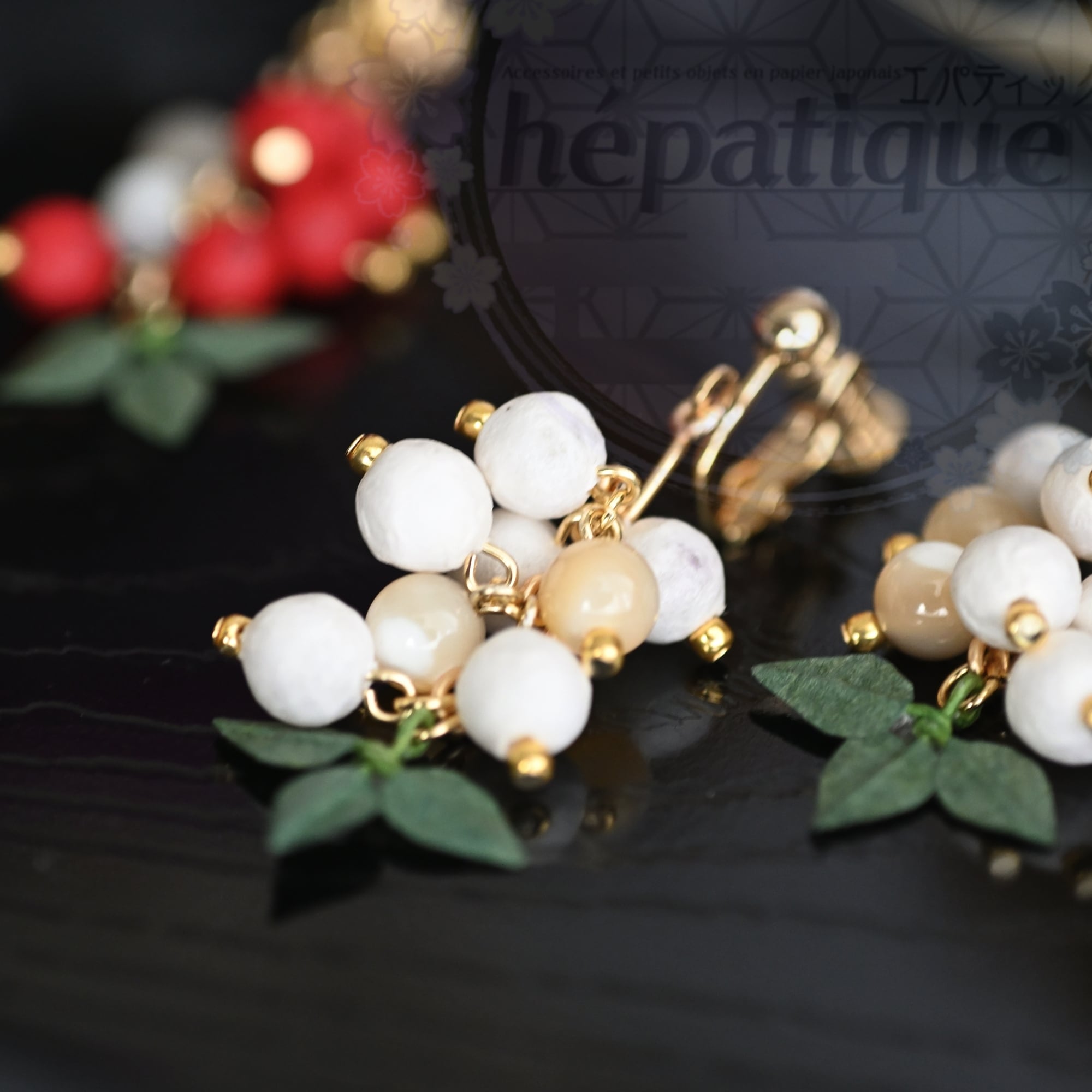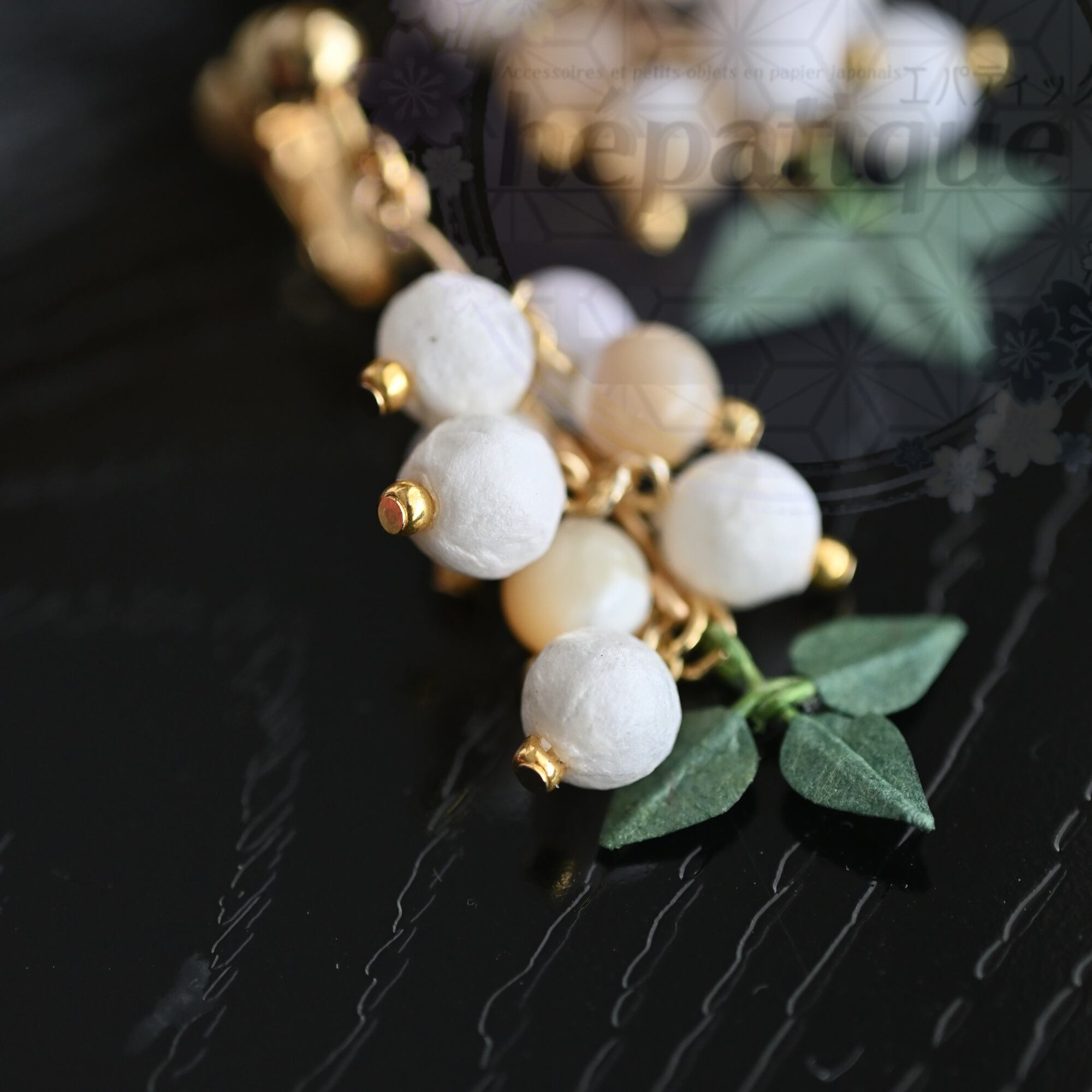 小さなビーズに和紙を丁寧に貼り付け、南天の実の独特な風合いを表現しています。さらに南天の実と共に揺れるマザーオブパールがキラキラと光を受けて輝き、和紙の質感をより引き立てます。