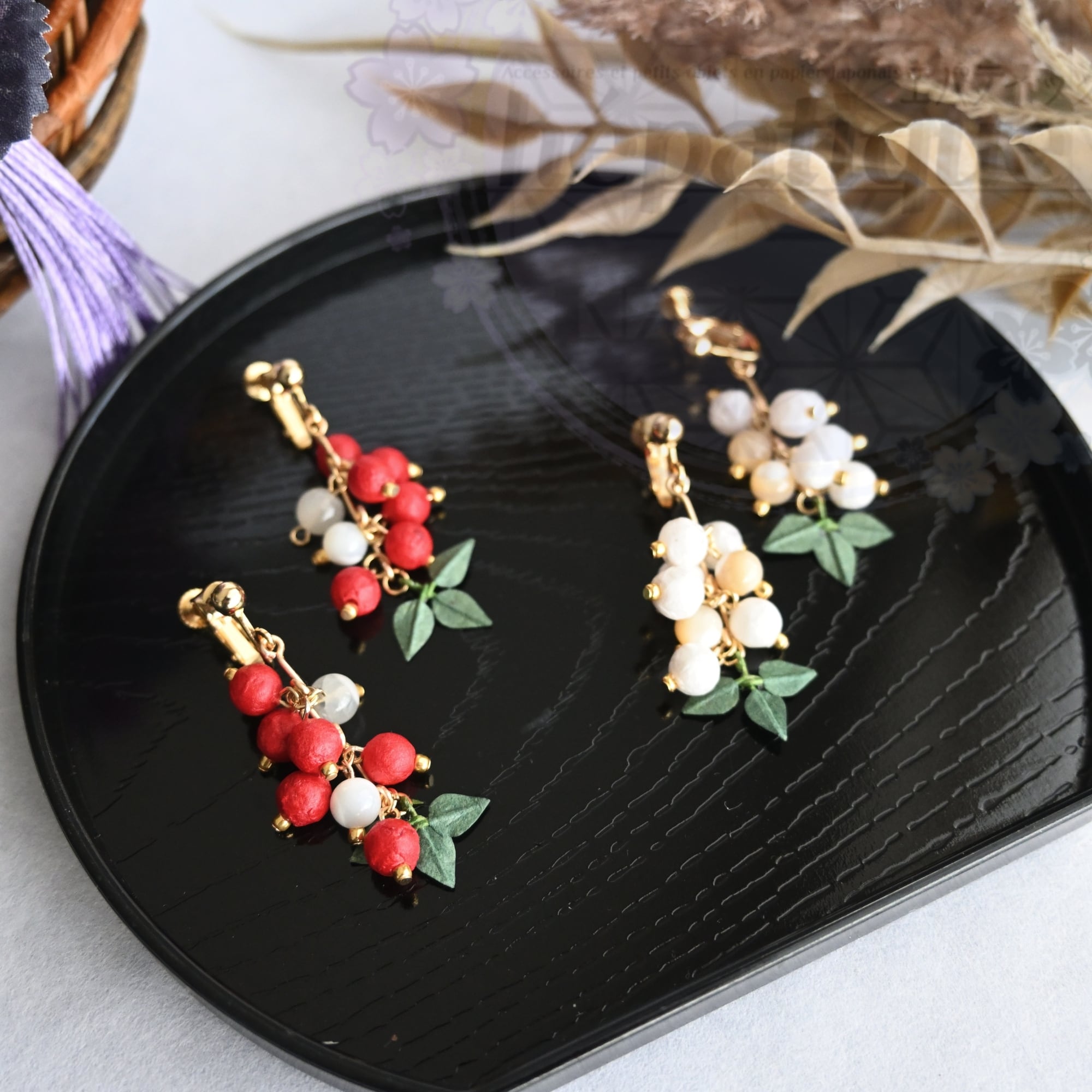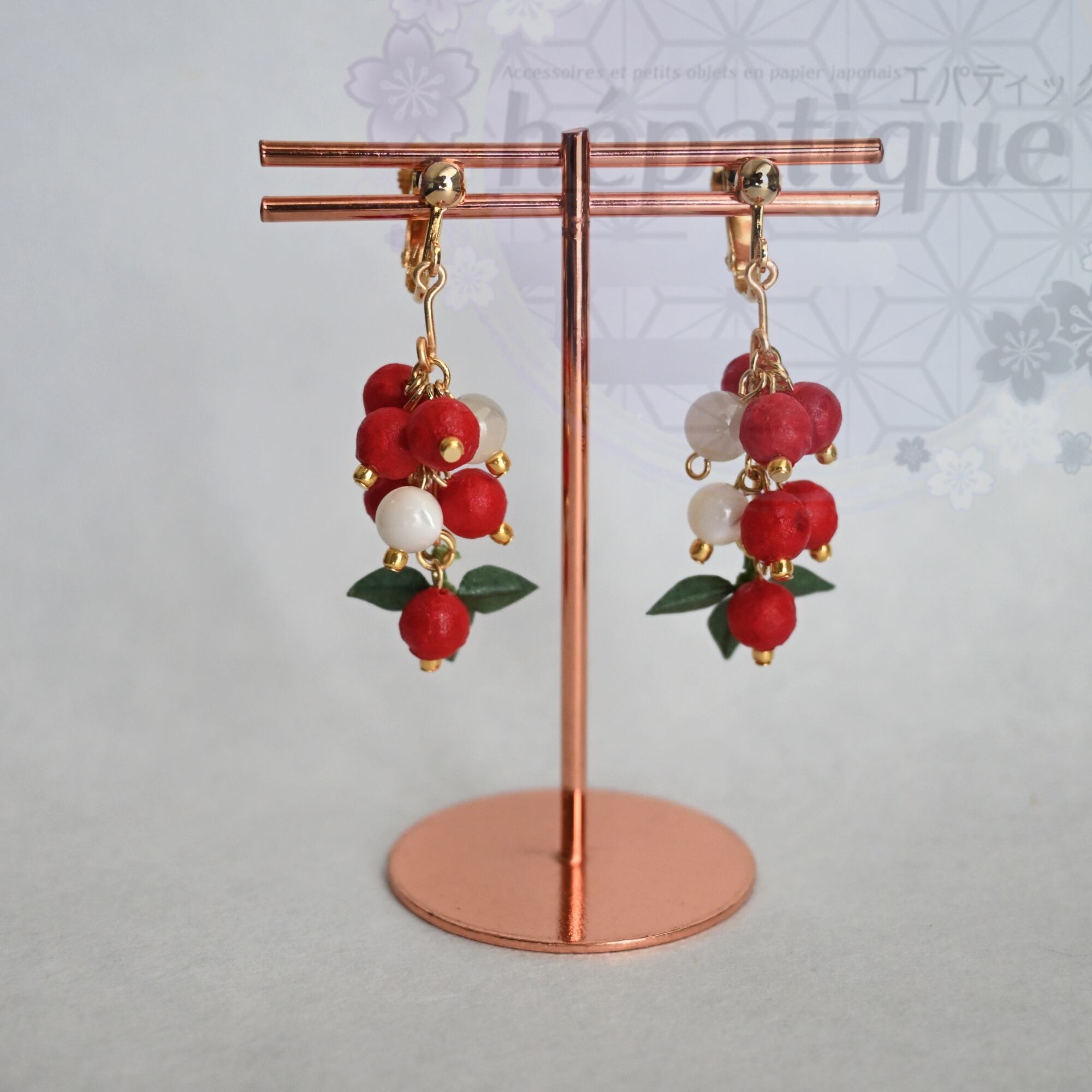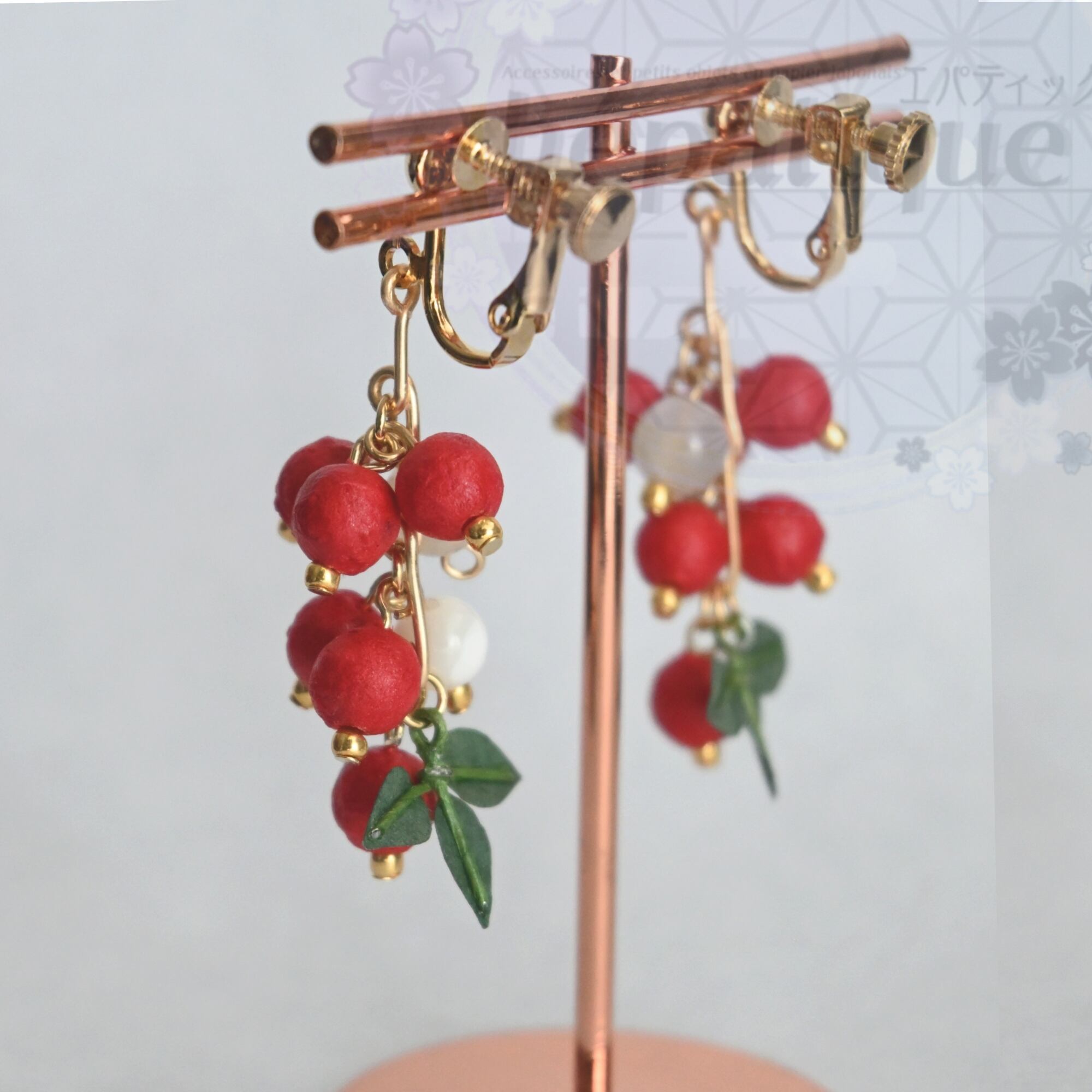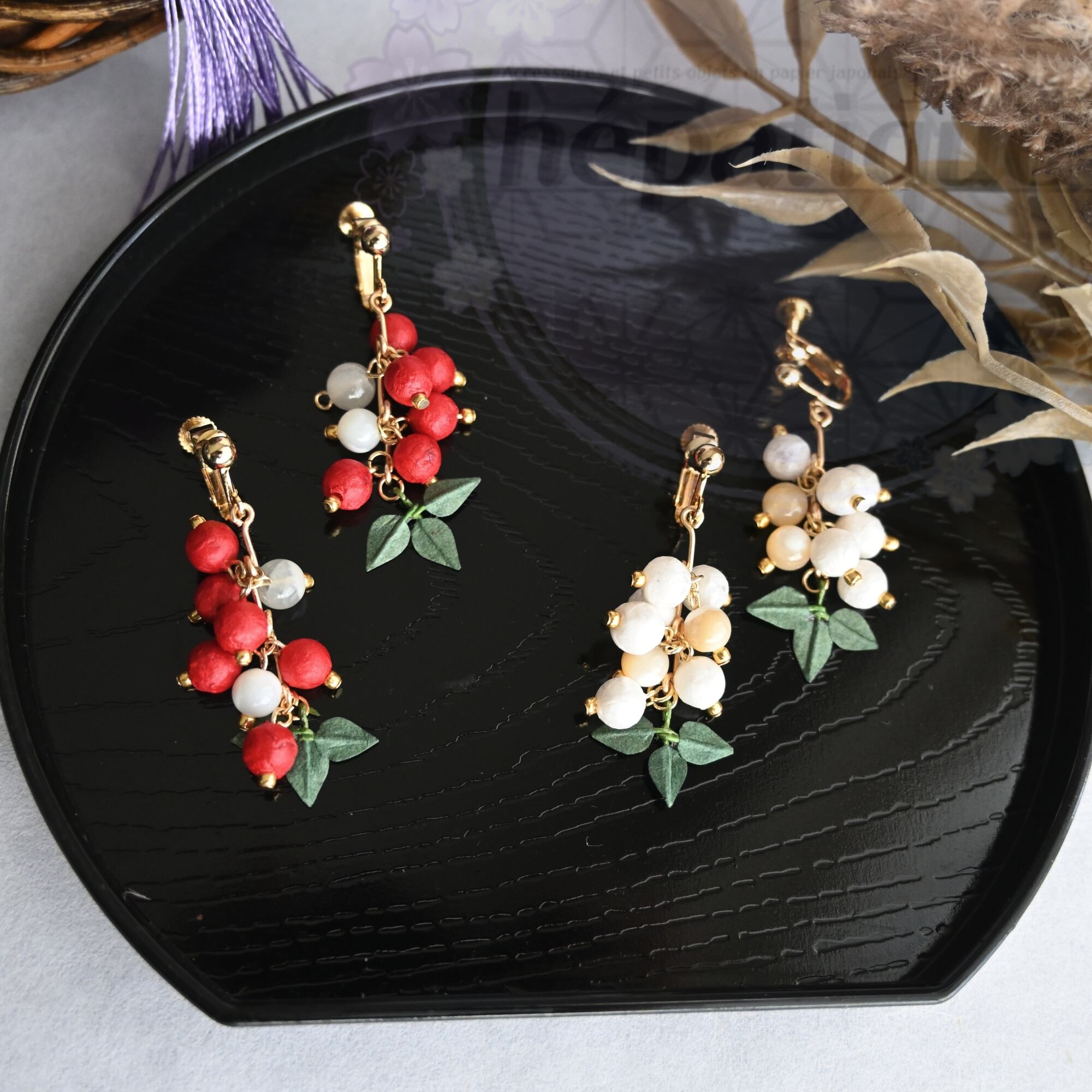 【南天の耳飾り:越中和紙ピアス/イヤリング】は、日本の冬を鮮やかに彩る南天の実を再現した美しいアクセサリーです。